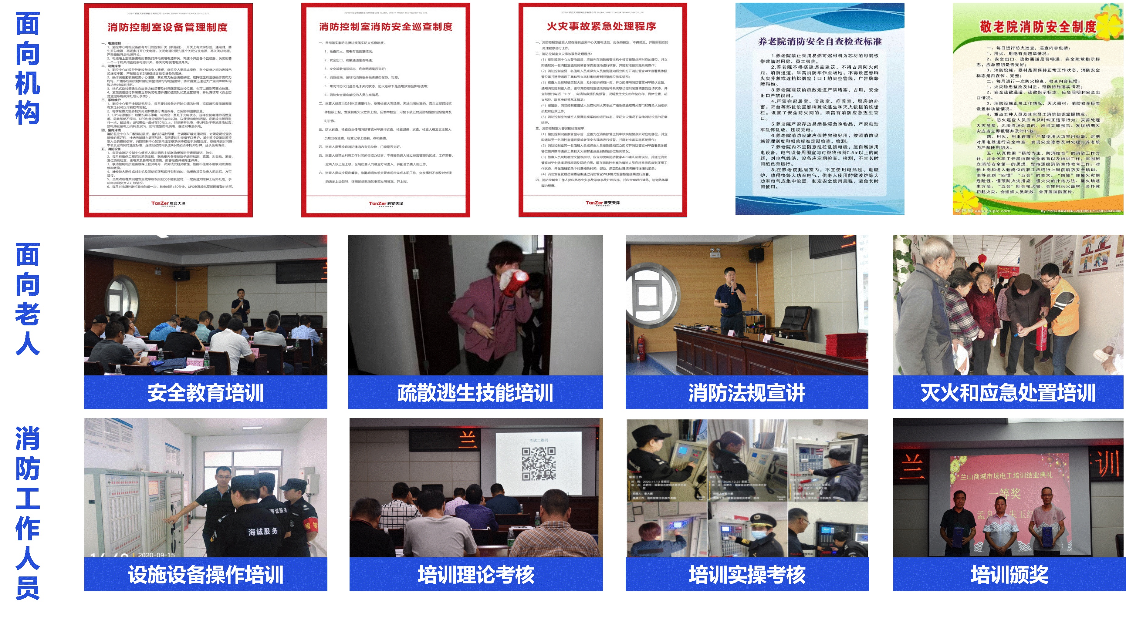 根據(jù)民政養(yǎng)老機構(gòu)消防安全管理要求,量身定制符合實際管理需求的消防安全管理體系。結(jié)合機構(gòu)安全現(xiàn)狀和隱患特點,制定涵蓋值班巡查、隱患排查、教育培訓、疏散演練等特殊場景的標準化流程,逐級落實消防安全責任、提升管理能力。同時提供以結(jié)果為導向的培訓服務,針對不同人員開展意識與技能培訓,提升安全從業(yè)人員專業(yè)能力,強化養(yǎng)老機構(gòu)老人的消防安全意識和自救能力。