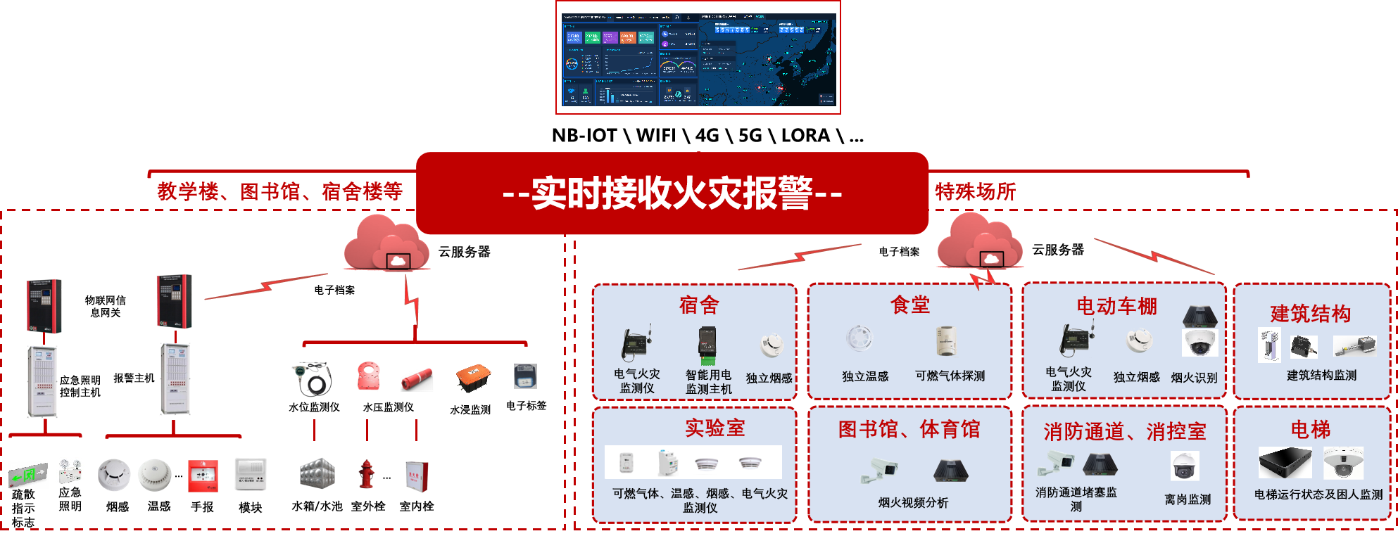 在宿舍區(qū)域安裝電氣火災(zāi)監(jiān)測(cè)預(yù)警系統(tǒng),實(shí)時(shí)監(jiān)控大功率電器的電流、電壓和溫度等數(shù)據(jù),并通過后臺(tái)大模型分析實(shí)現(xiàn)電氣安全研判;實(shí)驗(yàn)室除安裝煙感、溫感和電氣監(jiān)測(cè)設(shè)備外,還配備多種化學(xué)氣體監(jiān)測(cè)裝置,確保潛在隱患及時(shí)發(fā)現(xiàn);在室外電動(dòng)車棚處實(shí)行電氣、煙霧和視頻綜合監(jiān)測(cè),并安裝自動(dòng)噴淋系統(tǒng),確?;馂?zāi)初起時(shí)能夠及時(shí)發(fā)現(xiàn)和處置。