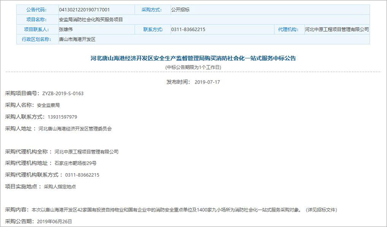 辰安天澤智聯(lián)技術(shù)有限公司成功中標(biāo)“河北唐山海港經(jīng)濟(jì)開(kāi)發(fā)區(qū)消防社會(huì)化一站式服務(wù)項(xiàng)目”,中標(biāo)金額2052萬(wàn)元人民幣。