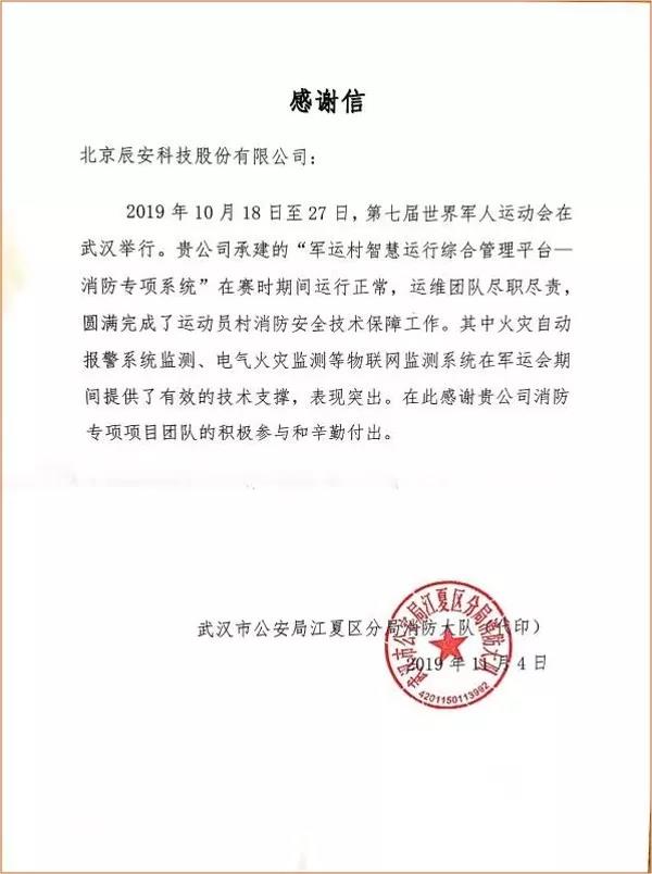 2018 年底,辰安科技成功中標(biāo)“第七屆世界軍人運動會運動員村、鐵人三項、定向越野安保及信息化建設(shè)項目”。其中,消防安全相關(guān)項目由辰安天澤全面承接建設(shè),依托清華大學(xué)合肥公共安全研究院的專家力量和領(lǐng)先技術(shù),通過智慧消防平臺為軍運村提供火災(zāi)防控、人員管理、滅火救援輔助等消防安全服務(wù)。